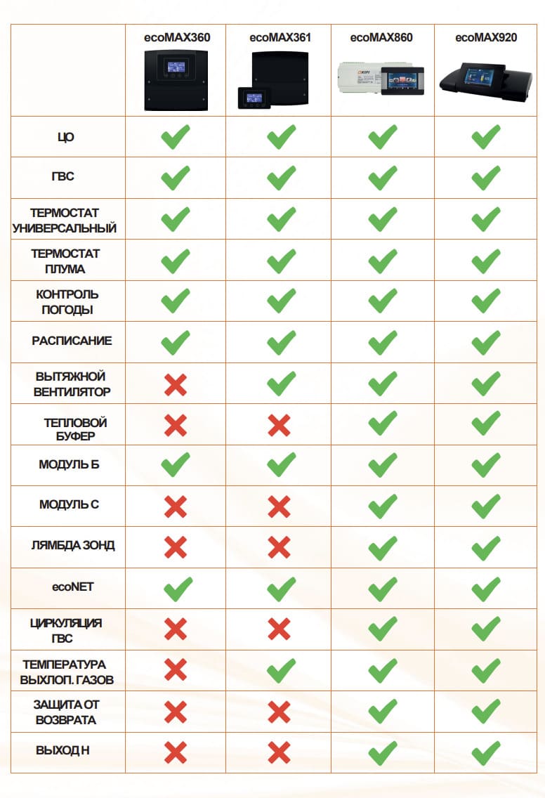 Регуляторы ecoMAX и ecoTOUCH 860 - это инновационные контроллеры с большим количеством возможных функций, согласованных с потребностями требовательных пользователей. Многие функции предусмотрены в стандартной комплектации, но могут быть дополнительно расширены с модулем B и C (см подробно в таблице). Хороший выбор для требовательных пользователей, обращающих сознательное внимание инновационным решениям.