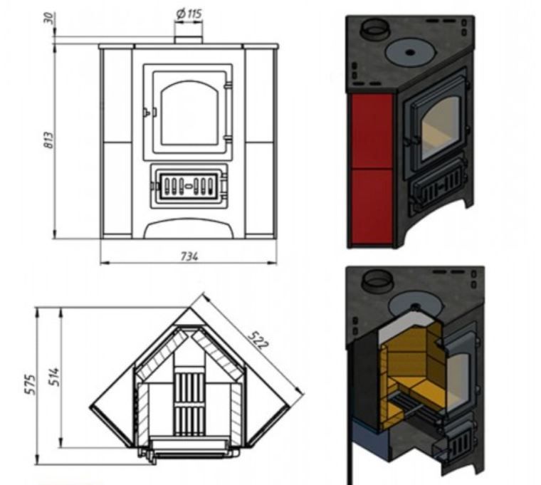 Диаметр дымохода 115 мм. Патрубок подключения к дымоходу без шиберной заслонки. Расположение дымохода сверху. Материал топки из шамота. Вес 120 кг. Гарантия 1 год.