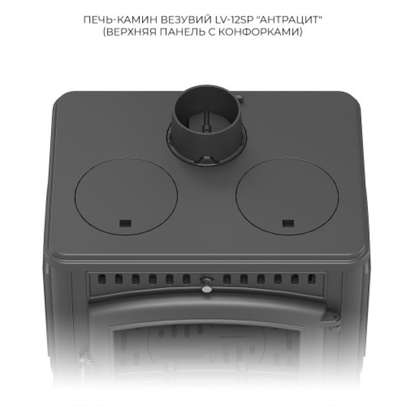 Печь-камин Везувий LV-12PS «Антрацит» — это мощная и многофункциональная модель, сочетающая в себе эффективный обогрев, эстетику живого огня и практичность варочной поверхности.