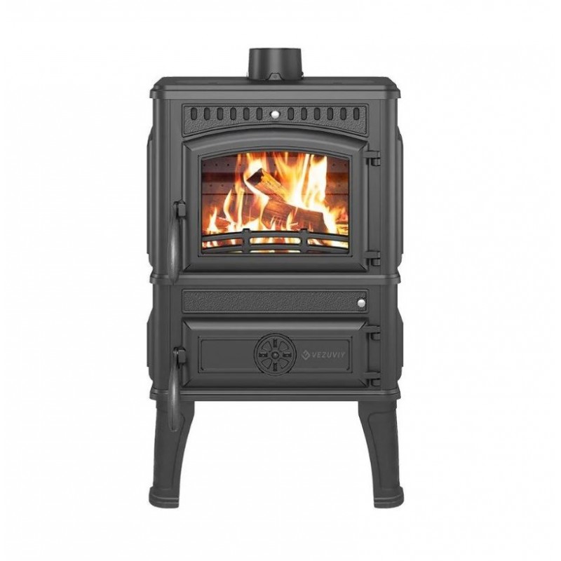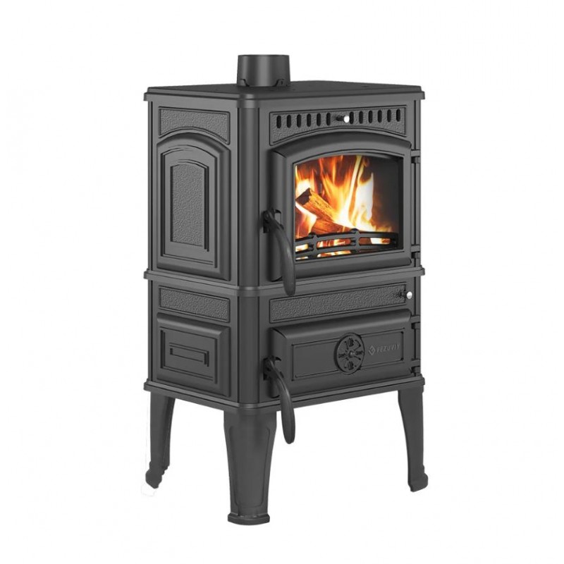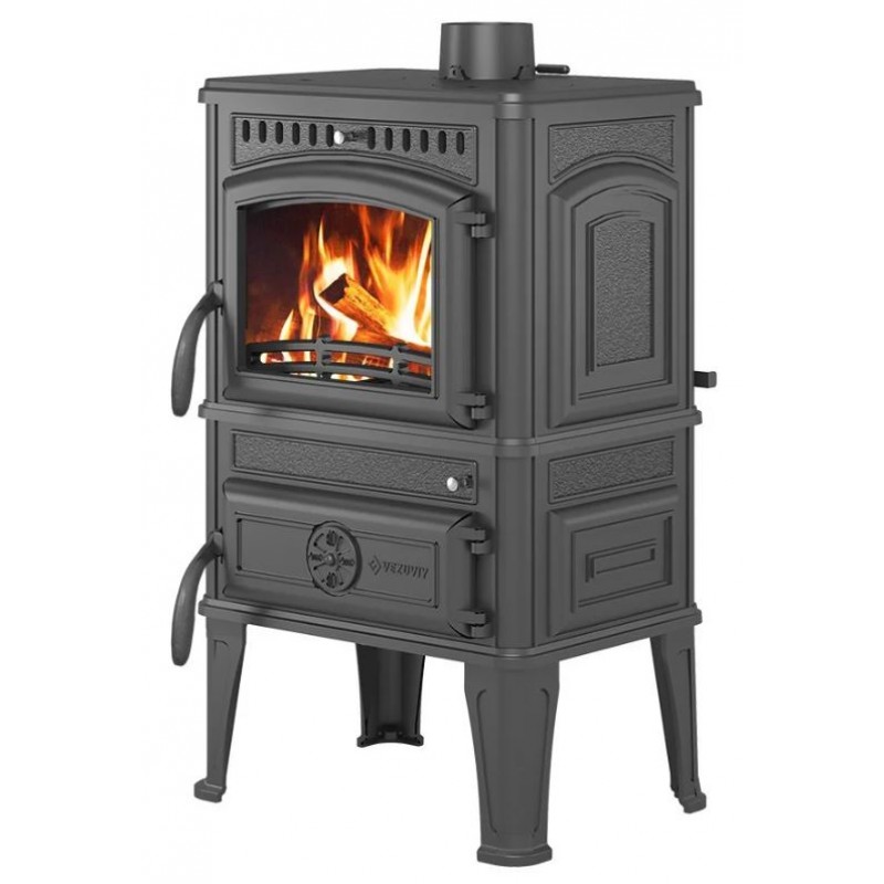 Печь-камин Везувий LV-12S "Антрацит" изготовлена из качественного жаростойкого чугуна (ГОСТ 1412-85) с толщиной стенок 6-8 мм. Вес печи составляет 155 кг. Модель рассчитана на обогрев помещений объёмом до 240 м³. Особенность LV-12S - в наличии варочной панели с конфорками в верхней части печи.