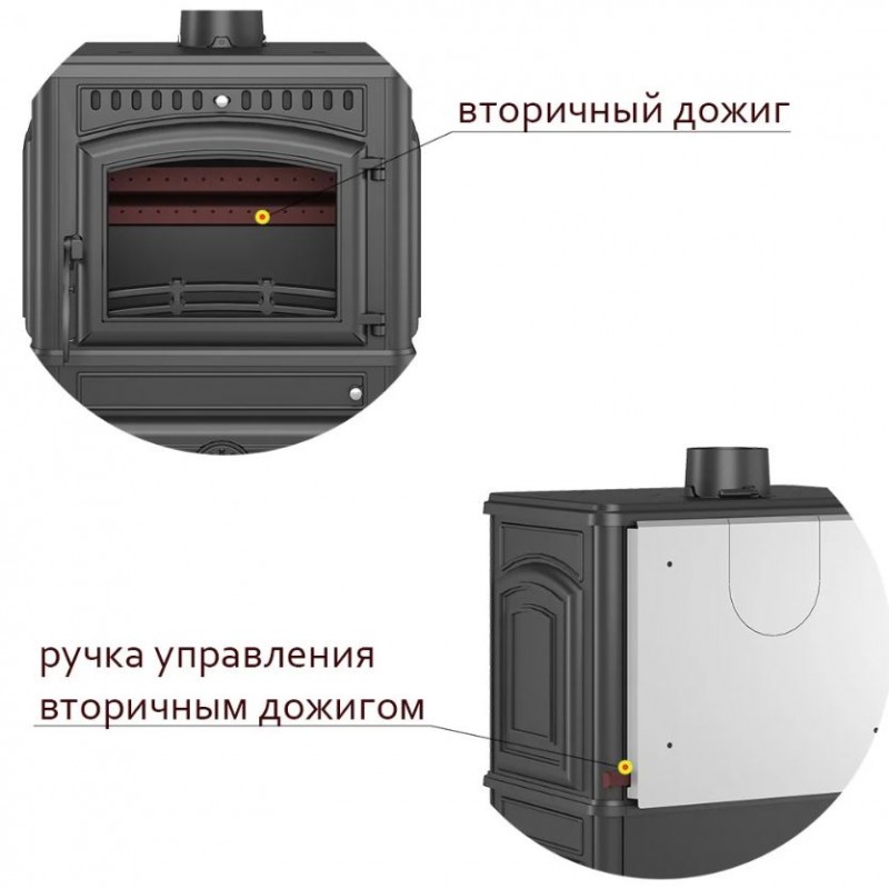 - Топка печи-камина усилена чугунными вставками с системой вторичного дожига. С помощью этой функции по каналам подачи вторичного воздуха поступает кислород, который нагревается при прохождении между топочной камерой и стенками корпуса. Далее нагретый воздух через дефлектор поступает в топку, перемешивается с газами - продуктами горения, чем вызывает повторное возгорание. Регулировка этой системы осуществляется рычагом, расположенным справа на тыльной стороне печи-камина.