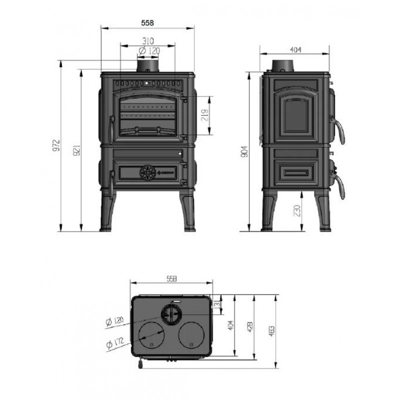 - подключение дымохода универсальное, Ø 120 мм;