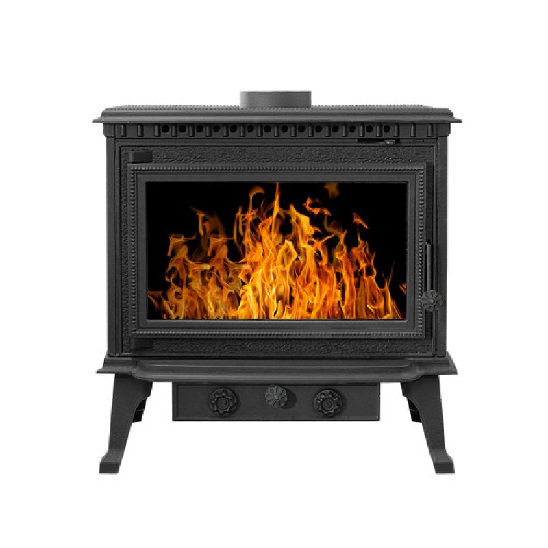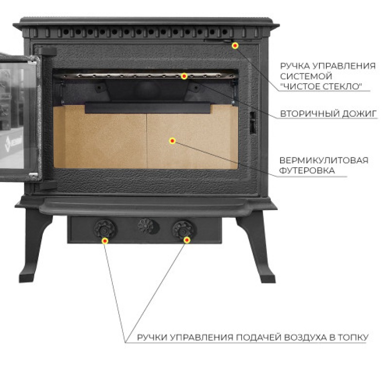 - Полный контроль над горением: Две вращающиеся заслонки в нижней части обеспечивают точную регулировку подачи воздуха для управления интенсивностью горения и длительностью работы на одной закладке дров.