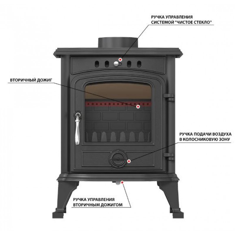 Над дверцей печи-камина расположена система чистое стекло, которая помогает оставаться стеклу чистым. В нижней части дверцы расположена ручка для регулировки подачи воздуха в колосниковую зону.