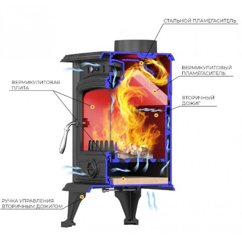 Боковые стенки и дно топки усилены вермикулитовыми плитами, задняя двойная чугунная стенка с системой вторичного дожига. С помощью этой функции по каналам подачи вторичного воздуха поступает кислород, который нагревается при прохождении между топочной камерой и стенками корпуса. Далее нагретый воздух через дефлектор поступает в топку, перемешивается с газами - продуктами горения, чем вызывает повторное возгорание. Регулировка этой системы осуществляется рычагом, расположенным в нижней части печи-камина.