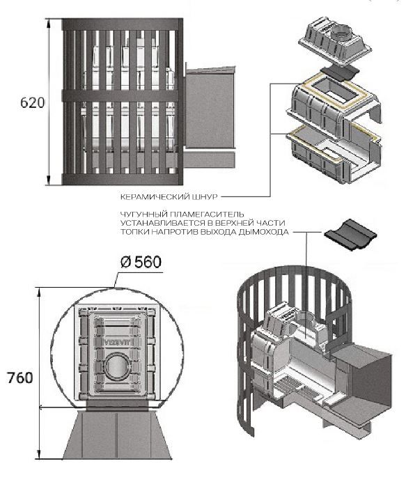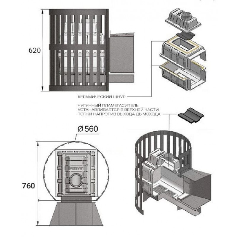 Печь для бани Везувий Легенда Ковка 16 (224) - чугунная печь для бани с кованной стальной сеткой для камней. Топка печи выполнена из двух отлитых частей стянута болтами, для герметичности соединения применяется уплотнительный шнур с рабочей температурой в 1200°C. В топке предусмотрен съемный чугунный зуб-отбойник для поворота пламени и увеличения КПД печи. Съемный отбойник пламени облегчает периодическую чистку печи от сажи. Снаружи на печь одевается кованная стальная сетка, в которую закладываются камни. Большая масса камней позволяет надолго сохранять тепло и защищает от сильного инфракрасного излучения, идущего от наружной стенки топки. Печь протапливается из соседнего с парной помещения бани (выносная топка).