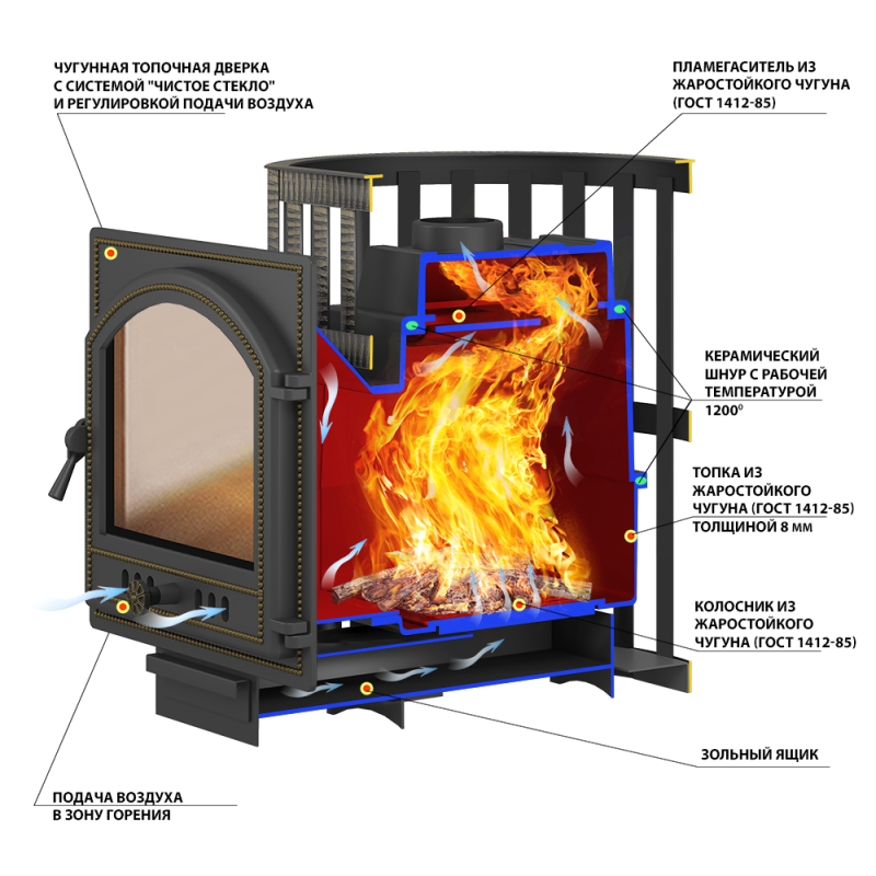 Банная чугунная печь Легенда Стандарт 16 (ДТ-4) укомплектована чугунной не герметичной дверцей Везувий ДТ-4. Конвекционно-вентилируемый кожух "Стандарт" изготовлен из металлического прутка диаметром 6мм покрашенной черной термостойкой краской. Эта печь подойдет для средних парных до 18 м³, а большое количество камней будет долго держать тепло в Вашем помещении.