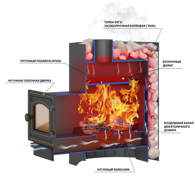 Воздух в зону горения подаётся через поддувало, его количество регулируется зольным ящиком совкового типа. Открытый зольник усиливает горение, закрытый – замедляет его. Чугунный пламегаситель перенаправляет поток горячего воздуха и дымовых газов к задней части топки. Это позволяет снять с печи максимум энергии в единицу времени. Чугунная дверь при нагревании не деформируется, сохраняет свою форму при остывании и предотвращает попадание продуктов горения на пол перед топкой.