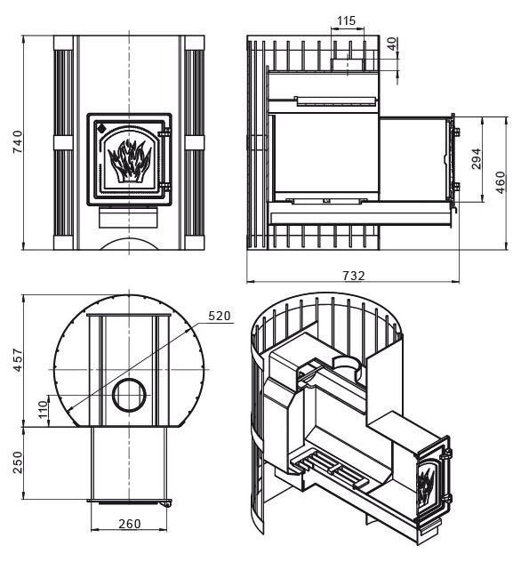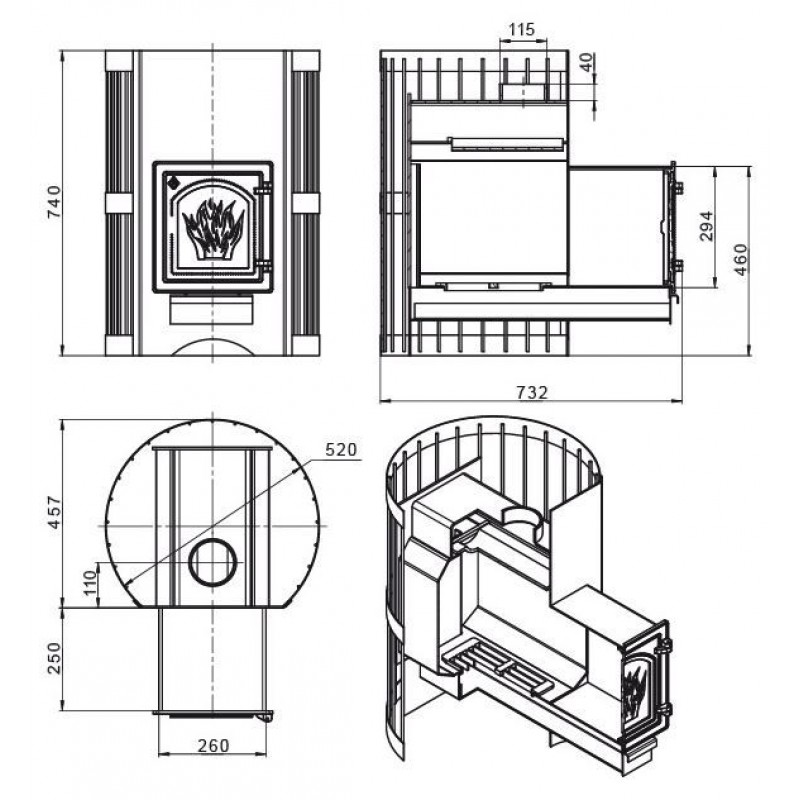 Съёмный чугунный колосник в сочетании со скошенными краями боковой части стенки облегчает уход за топкой, уборки золы и несгоревших углей.