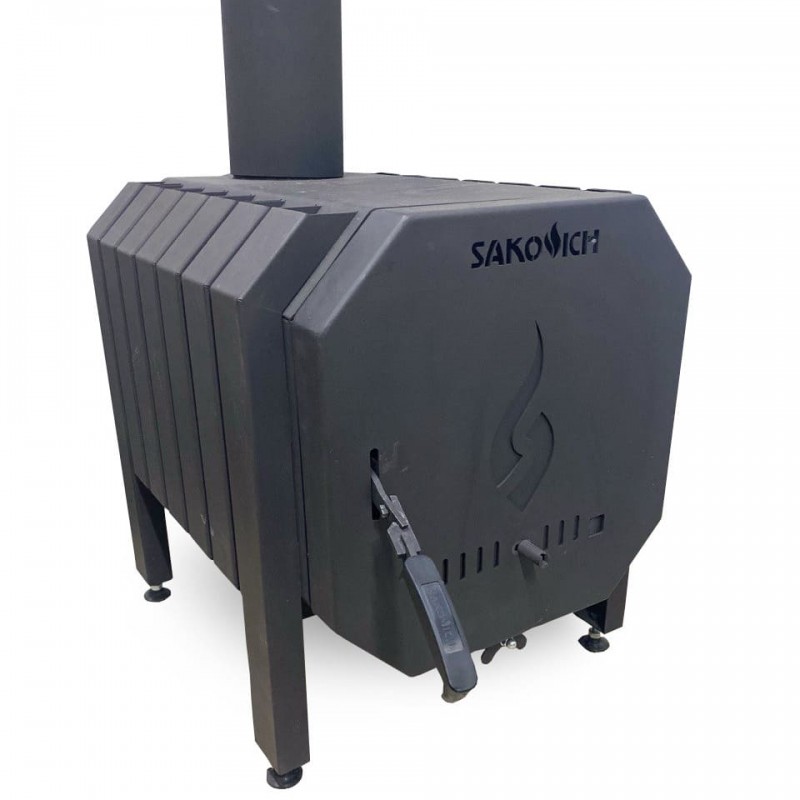 Корпус печи Promka выполнен из котловой стали 3-5 мм. Он имеет особое строение: с наружной части - трубное оребрение - оно снимает тепло с печи, а внутри топки - жаропрочный шамот, который аккумулирует тепло и сохраняет печь от перегрева.