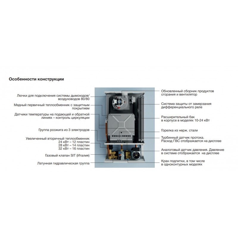 - газовый клапан SIT; аналоговый датчик давления, давление в системе отображается на дисплее котла;