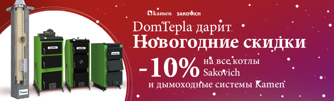 DomTepla дарит Новогодние скидки! 10 % на твердотопливные котлы SAKIVICH 10 % и на комплекты керамических дымоходов KAMEN.