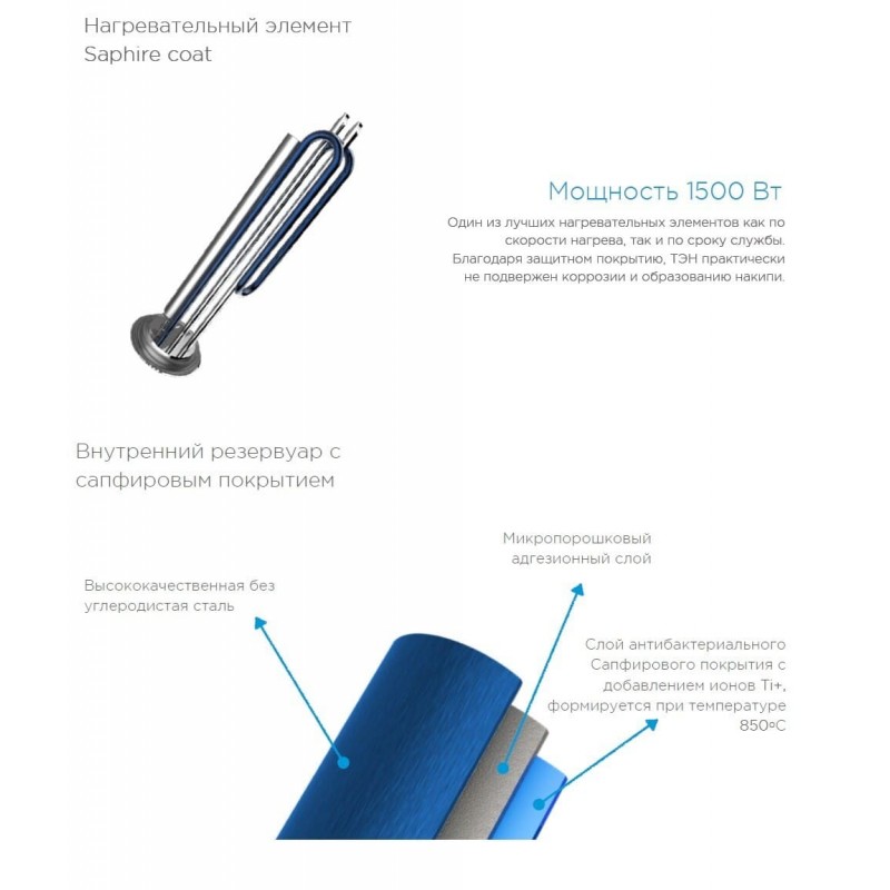 - внутренний резервуар покрыт слоем сапфировой эмали с добавлением ионов Ti+;